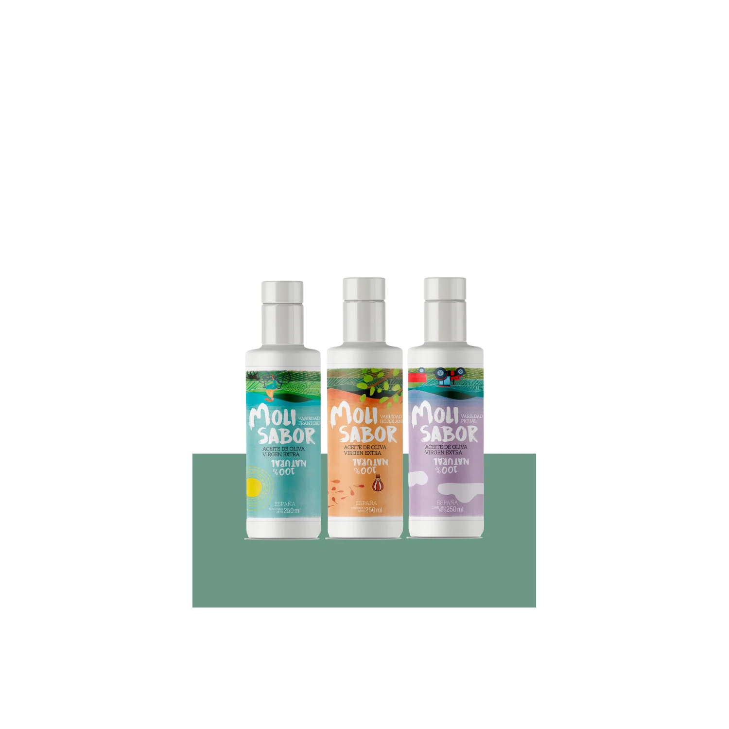 Das Paket enthält je eine Flasche jeder Molisabor-Sorte: Hojiblanca, Picual und Frantoio.