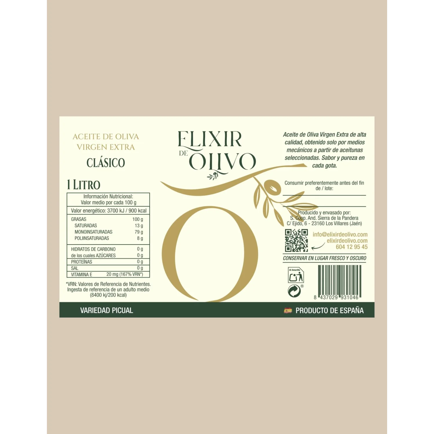 Es un Aceite de Oliva Virgen Extra de montaña, obtenido directamente de aceitunas de la variedad picual, cultivadas en La Sierra De La Pandera y recolectadas en Noviembre y Diciembre, en su punto óptimo de maduración, en envero y procesadas mediante procesos mecánicos.