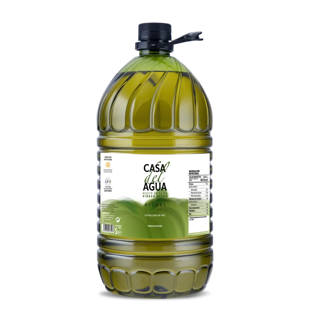 Natives Olivenöl extra der Sorte Picual, hergestellt in Jaén, Casa del Agua ist ein reiferes Öl als die Reserva Familiar, da der Erntezeitpunkt etwas später in der Kampagnenperiode liegt und es eine leichtere Fruchtigkeit aufweist. Es wird in Glas- und PET-Formaten abgefüllt, gedacht für den Massenkonsum oder den Familiengebrauch.