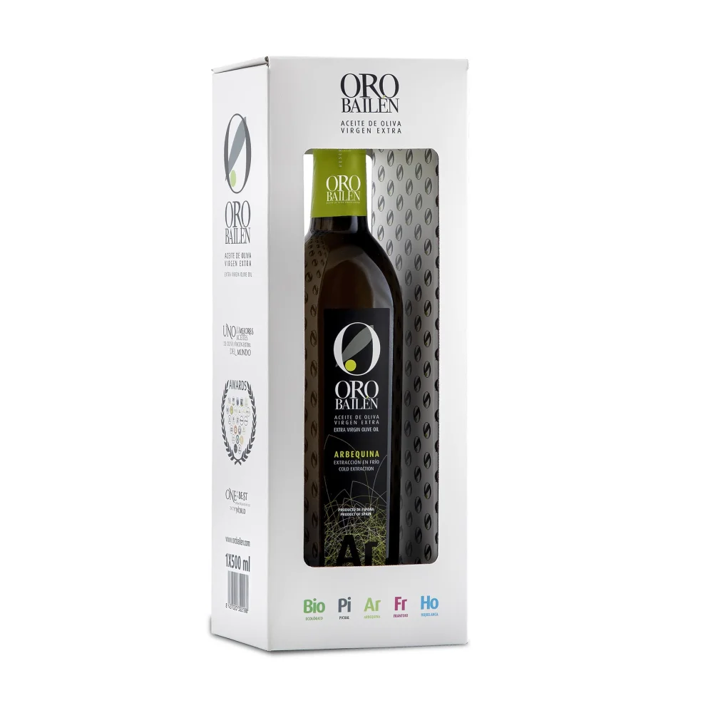 Premium natives Olivenöl extra aus der Sorte Arbequina, hergestellt in Jaén. Es gilt als eines der besten Olivenöle der Welt, Oro Bailén Reserva Familiar Arbequina wird jeden Monat und je nach Nachfrage abgefüllt, ausschließlich in zwei Verpackungsarten – in dunklem Glas und in der Dose –, um es vor Fotooxidation zu schützen.