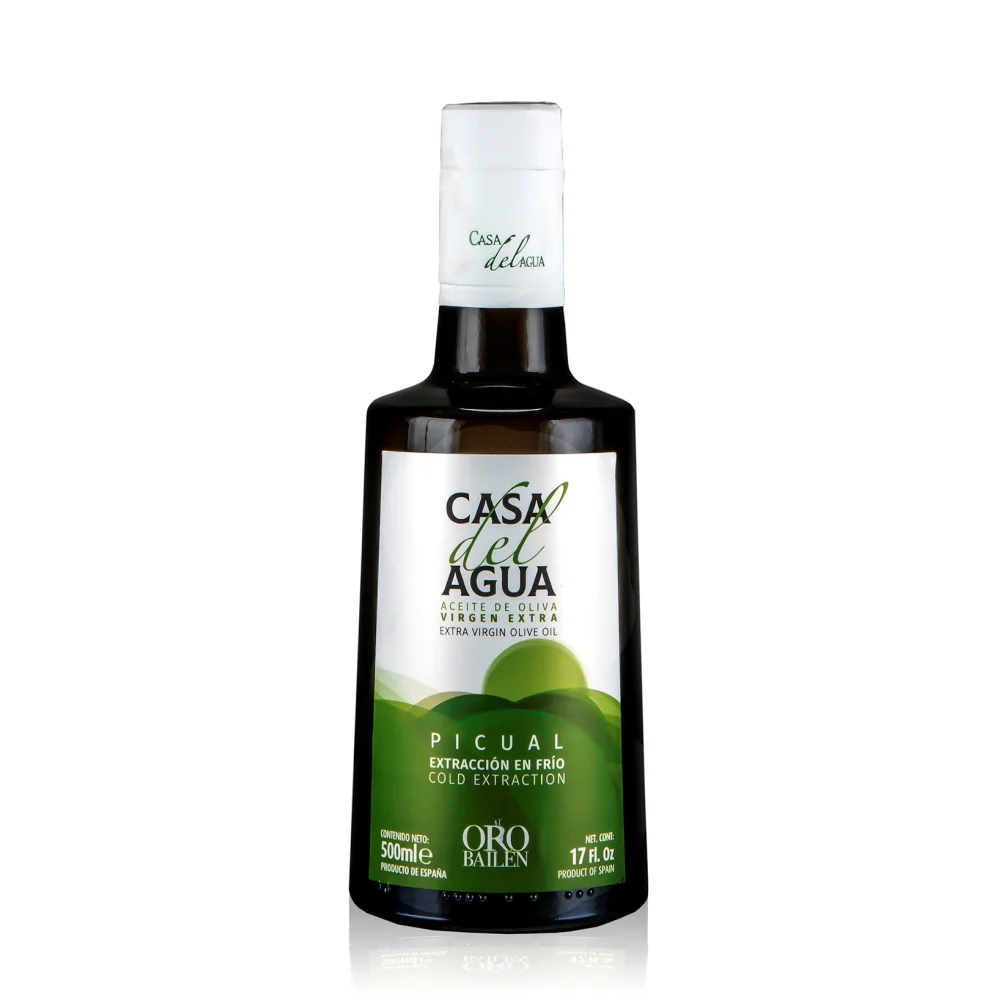Natives Olivenöl extra der Sorte Picual, hergestellt in Jaén, Casa del Agua ist ein reiferes Öl als die Reserva Familiar, da die Erntezeit etwas später in der Kampagnensaison liegt und ein leichteres Fruchtaroma aufweist. Es wird in Glas- und PET-Formaten abgefüllt, gedacht für den Massenkonsum oder den Familiengebrauch.