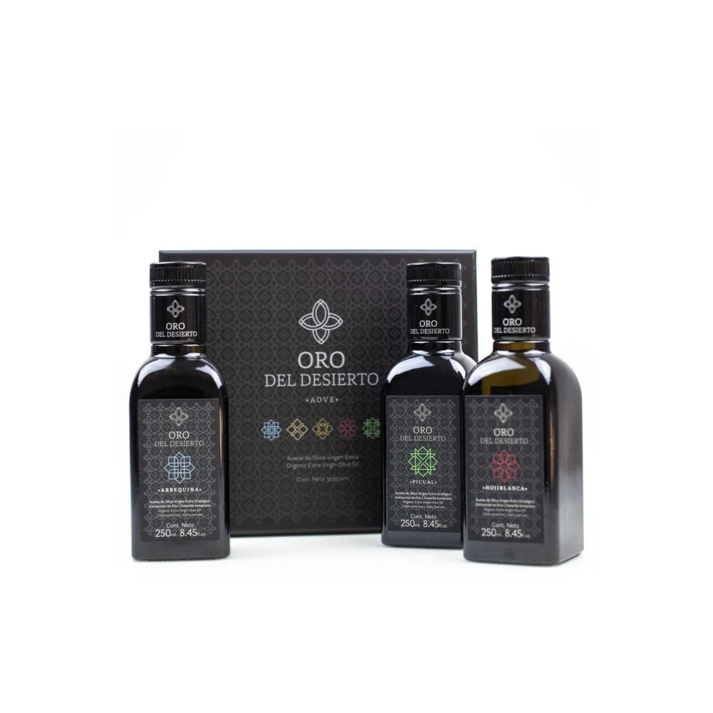 Geschenkset mit 3 verschiedenen sortenreinen Olivenölen: Arbequina, zart und mit fruchtigen Noten; Hojiblanca, mittelfruchtig mit sanften Nuancen beim ersten Eindruck am Gaumen, spätes, anhaltendes und elegantes Pikantsein; und schließlich Picual, intensiv fruchtig, mit kräftigem Körper beim Auftakt, bitterer und etwas weniger pikant, mit pflanzlicher Note.