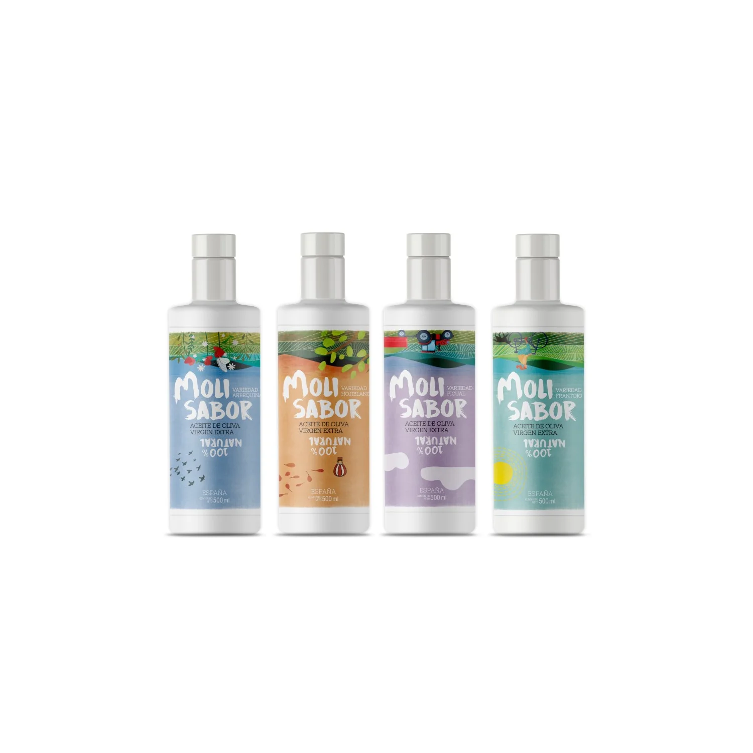 Das Paket enthält je eine Flasche jeder Molisabor-Sorte: Arbequina, Hojiblanca, Picual und Frantoio.