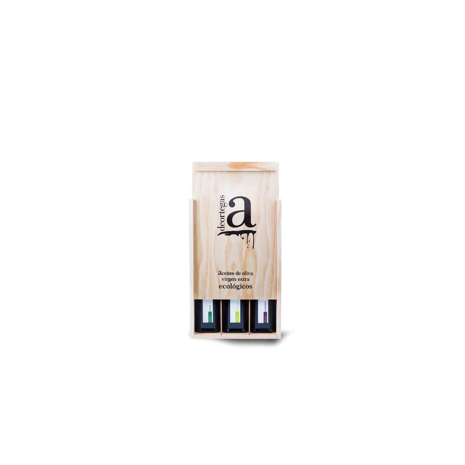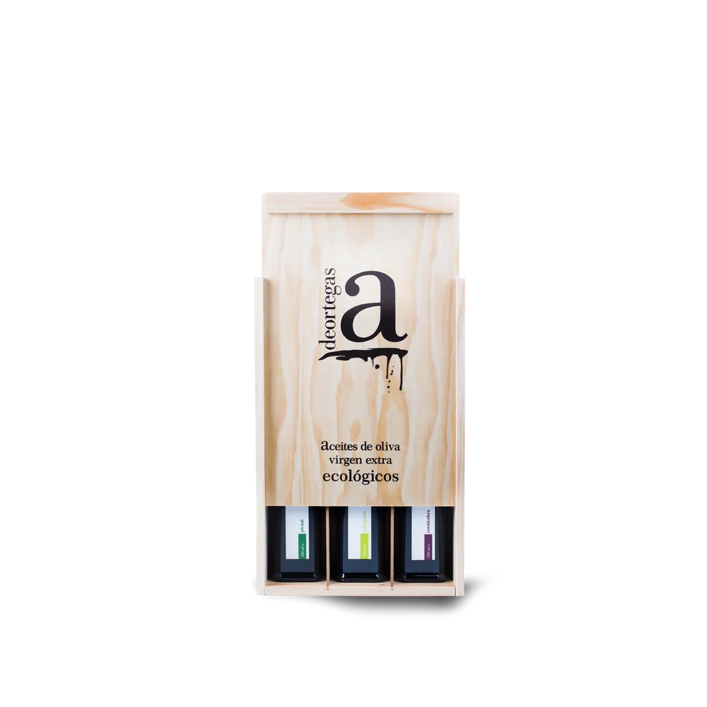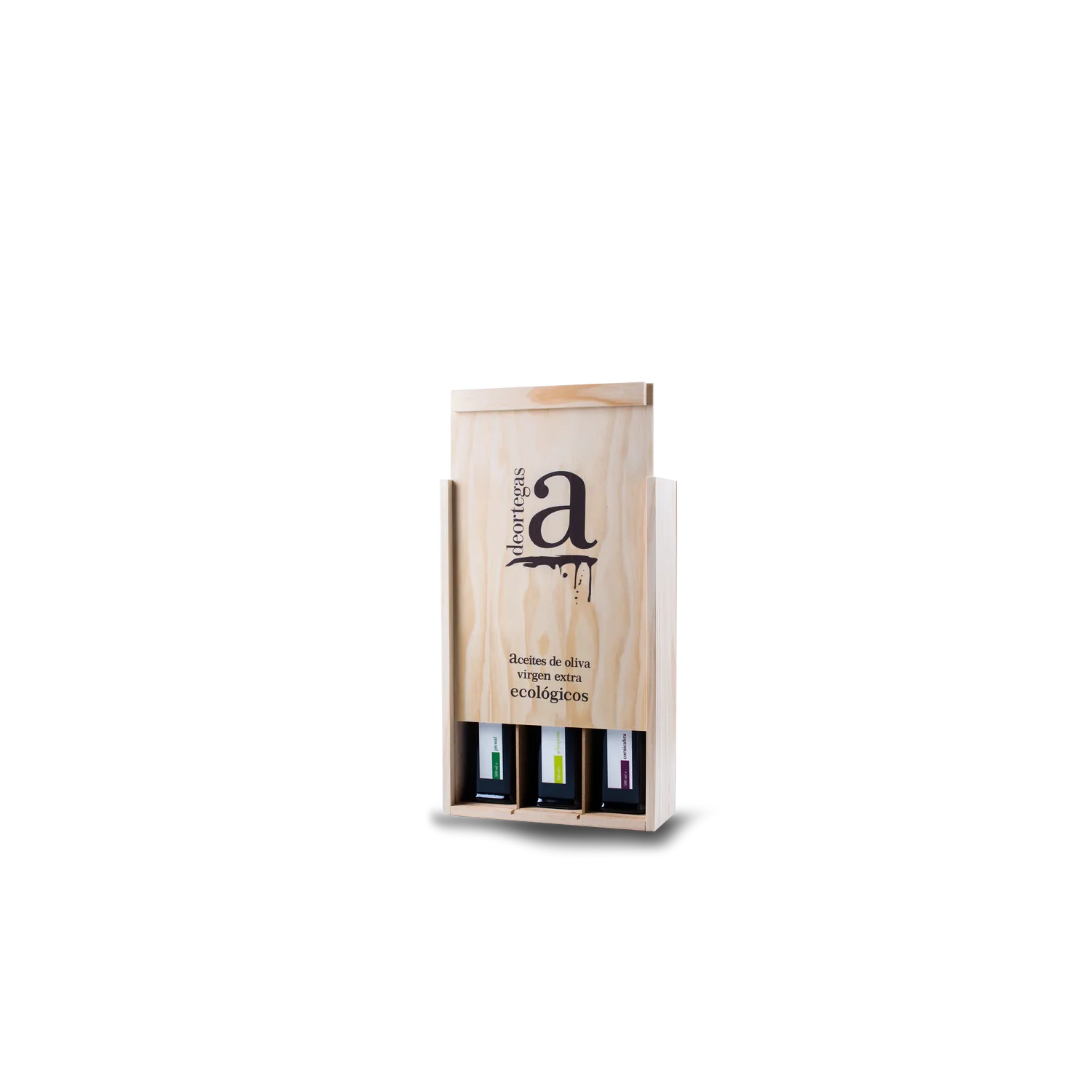 Exklusives Holzset mit drei 500-ml-Flaschen mit ökologischem nativem Olivenöl extra, in dem du drei der vier verfügbaren Sorten verkosten kannst: Arbequina, Picual und Coupage.