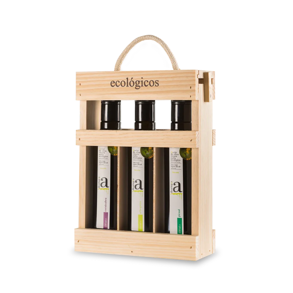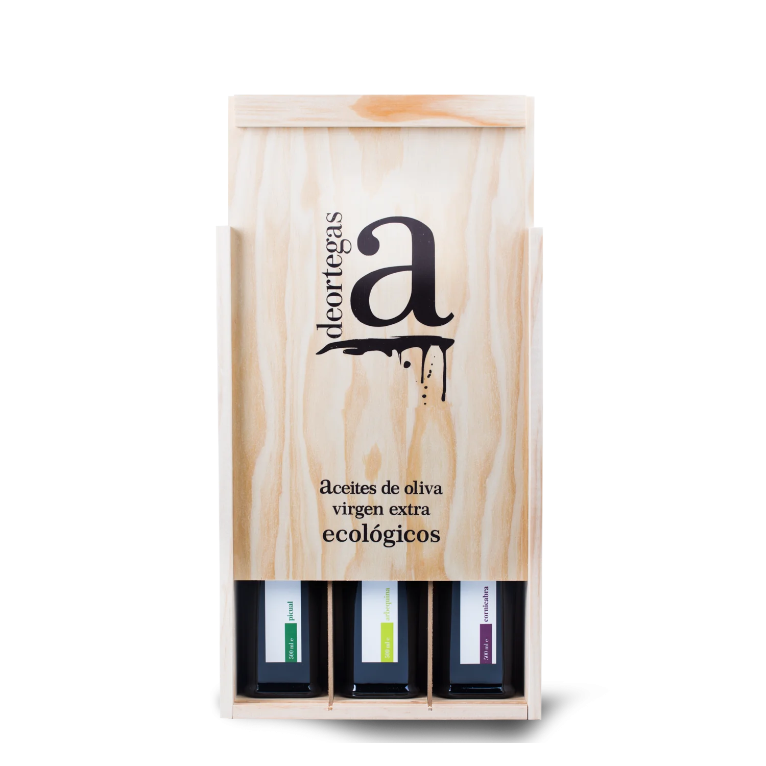 Handgefertigte Holzkassette von guter Qualität. Ideal zum Verschenken, enthält drei 500-ml-Flaschen Bio-natives Olivenöl extra, in denen du die Sorten probieren kannst: Arbequina, Picual und Cornicabra.