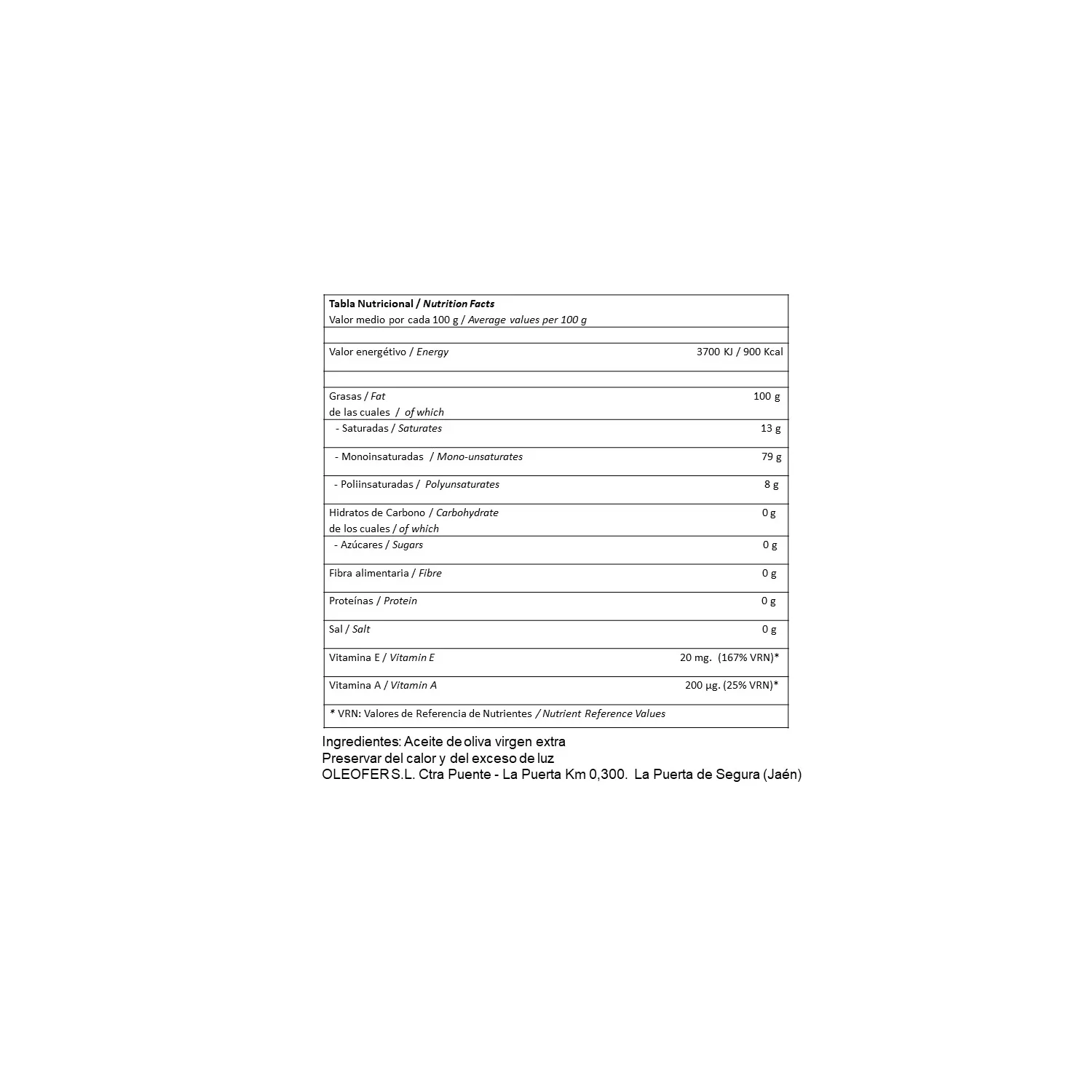 Aceite de oliva virgen extra elaborado con aceitunas de la variedad Picual, procedentes del Parque Natural de Cazorla, Segura y Las Villas y con la certificación de calidad de la segunda Denominación de Origen más antigua de España, la D.O. Sierra de Segura.