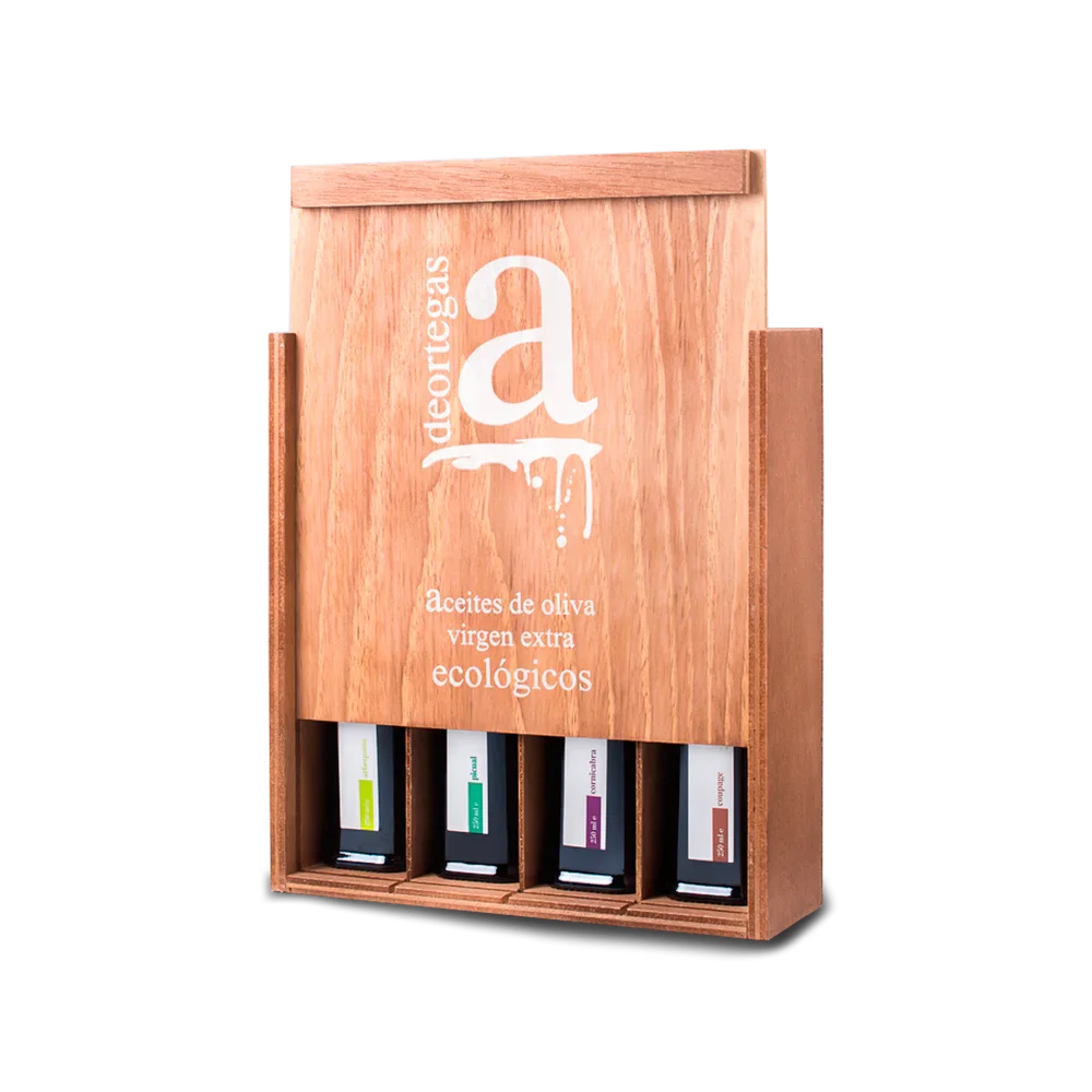 Étui en bois exclusif avec quatre bouteilles de 250 ml d’huile d’olive vierge extra biologique, où vous pourrez déguster nos quatre variétés : arbequina, picual, cornicabra et coupage.