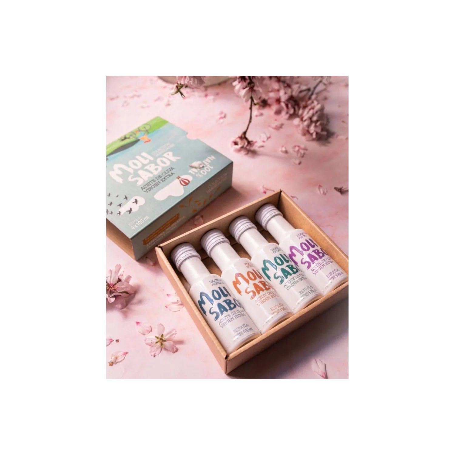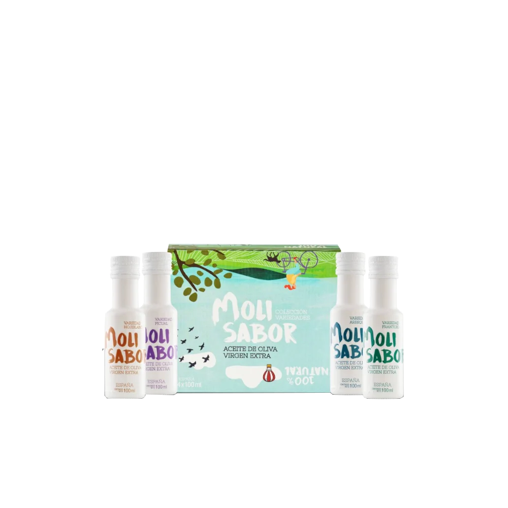 礼盒包含每种 Molisabor 品种各一瓶: Arbequina、Hojiblanca、Picual 和 Frantoio.