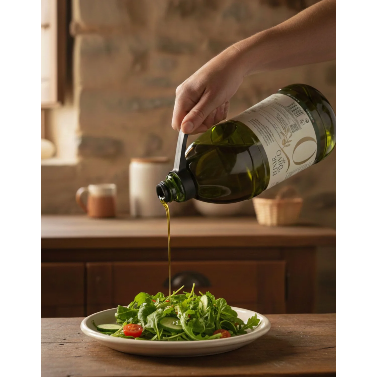 Es un Aceite de Oliva Virgen Extra de montaña, obtenido directamente de aceitunas de la variedad picual, cultivadas en La Sierra De La Pandera y recolectadas en Noviembre y Diciembre, en su punto óptimo de maduración, en envero y procesadas mediante procesos mecánicos.