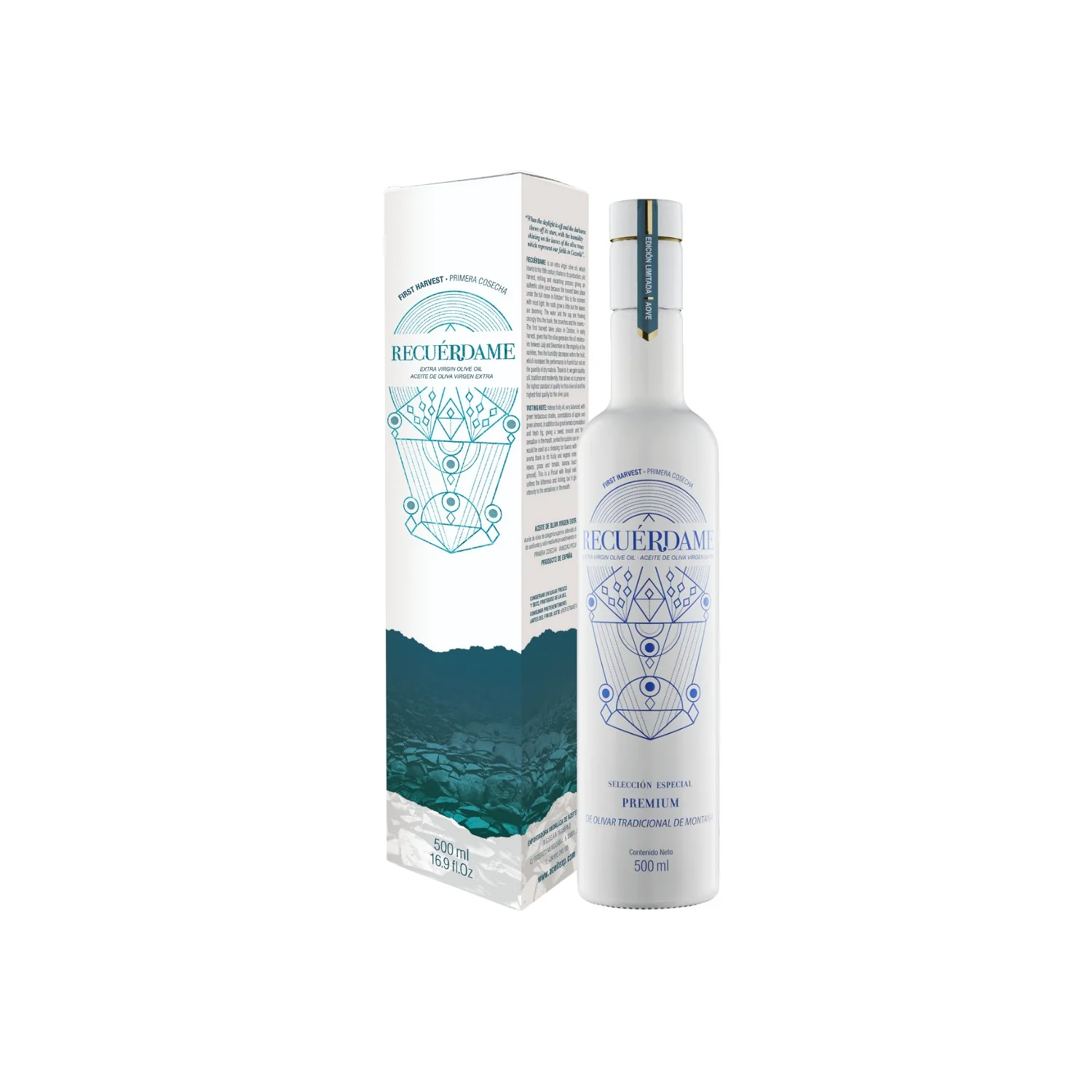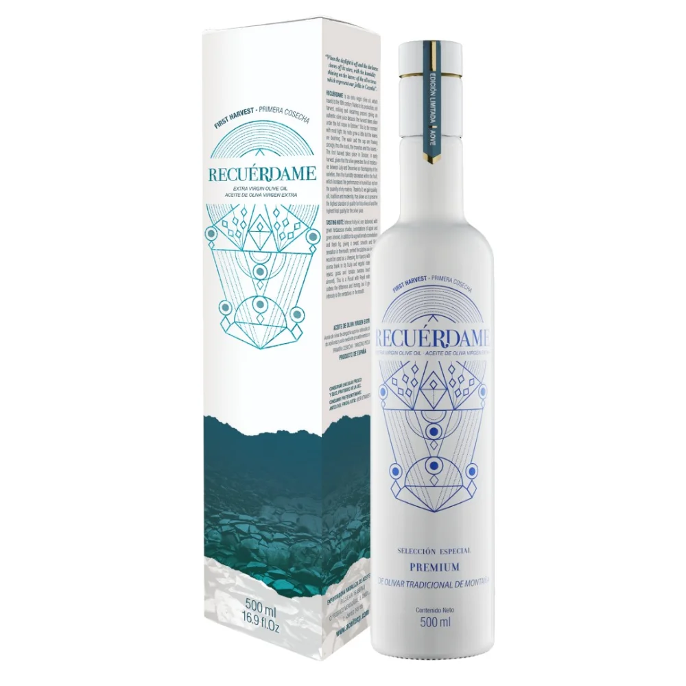 Recuérdame 是一款优质的早采特级初榨橄榄油,采用10月收获季最初几天采摘的皮夸尔(Picual)橄榄制成。包装盒内含12瓶