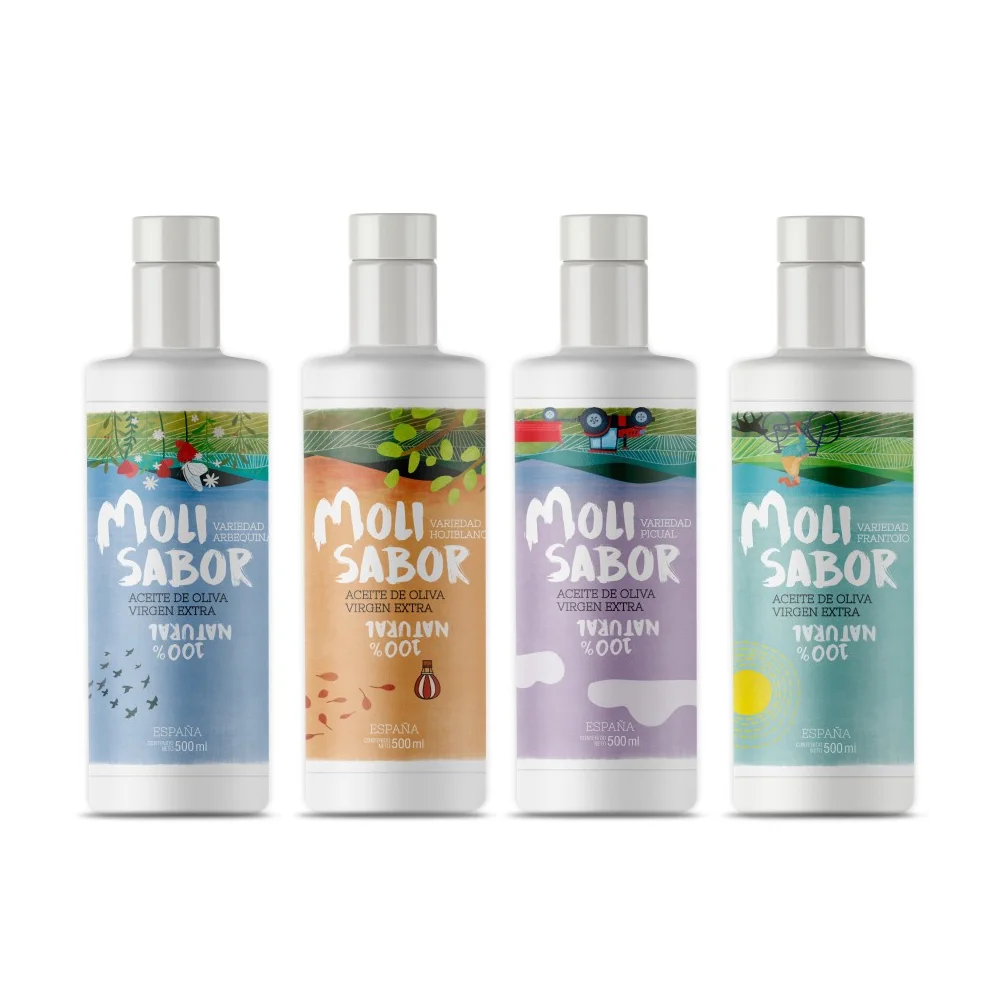 该套装包含每种 Molisabor 品种各一瓶: Arbequina、Hojiblanca、Picual 和 Frantoio.